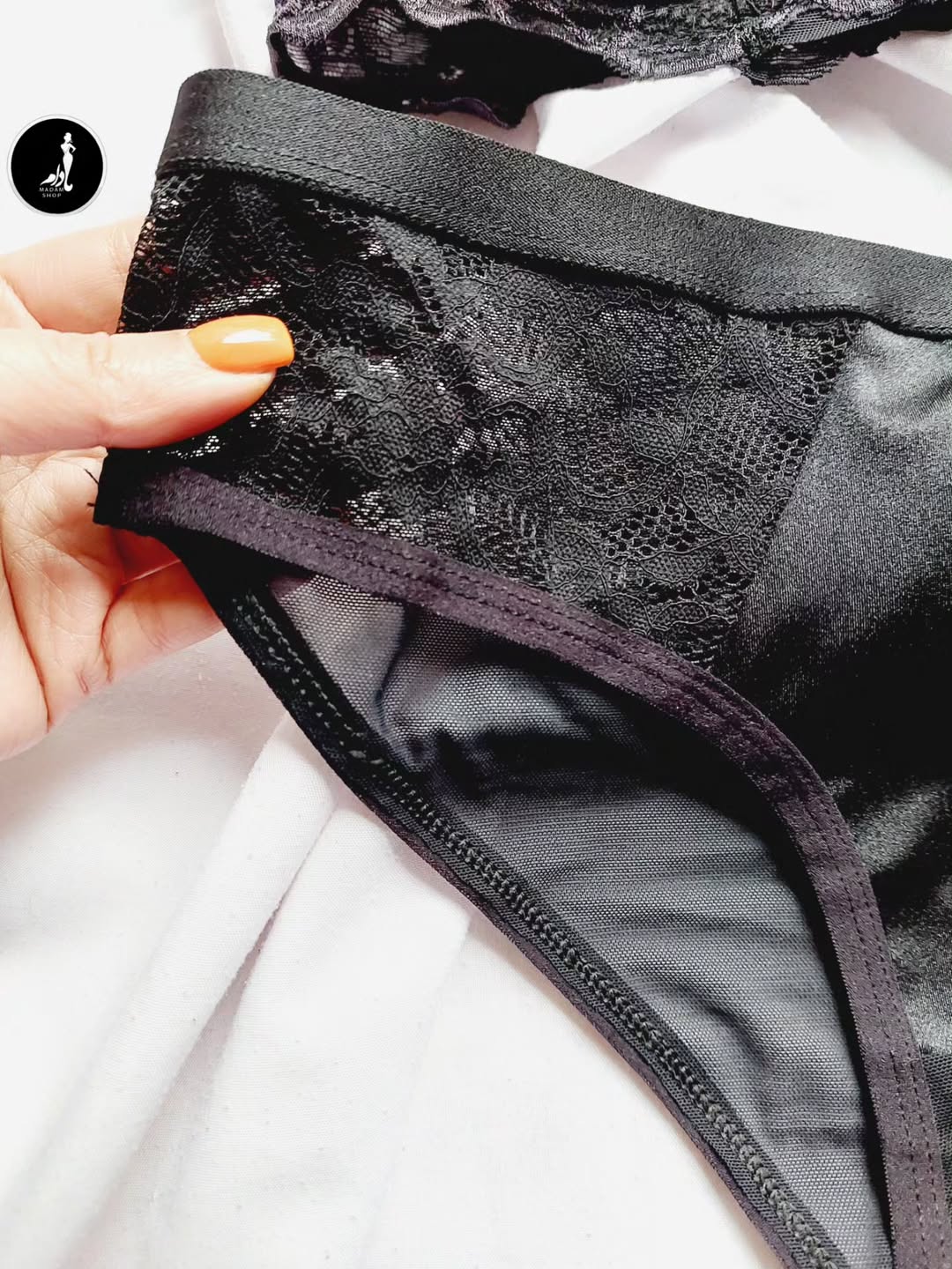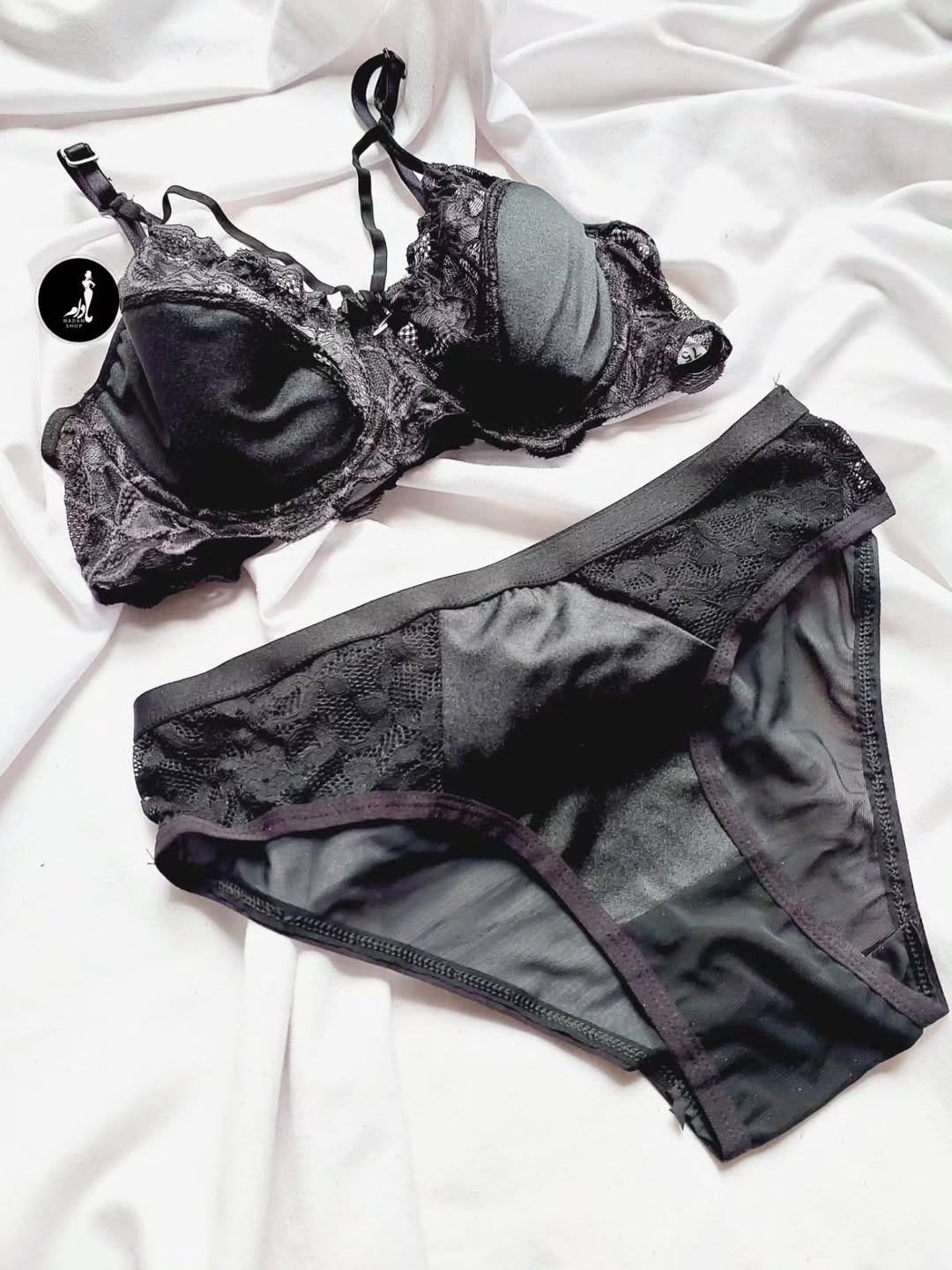 این ست شامل سوتین با پدی است که برجستگی سینه را پوشش میدهد و ایستایی خوبی دارد. شورت آن دارای کشسانی عالی و فاق نخی است. همچنین گیپور زیبایی دارد.
